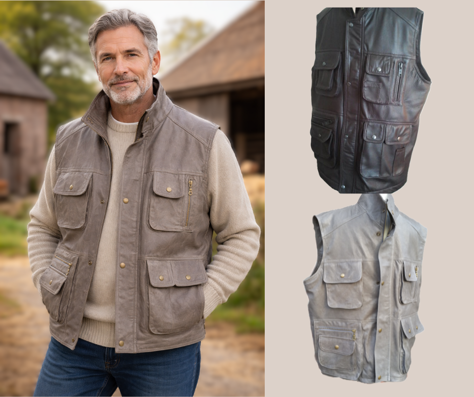 Leren bodywarmer met een hoeveelheid aan zakken buiten zijde, binnen zijde 2 x grote binnenzakken. Met rits en drukkers. In diverse kleuren.